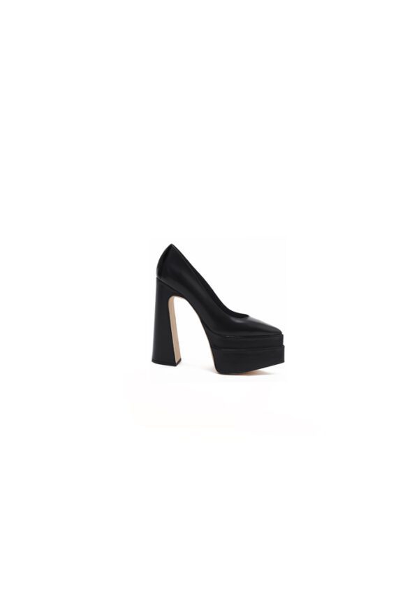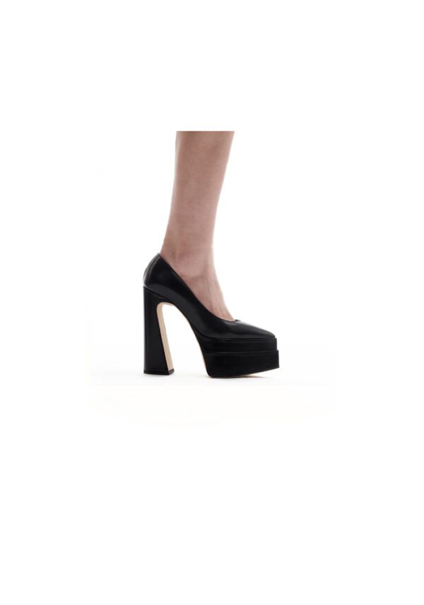 The Double Plateau Heels are designed in premium black calf leather with a matte finish, featuring a sleek double platform heel that blends height with stability. Designed for both style and comfort, its cushioned insole and balanced construction ensure easy wear.